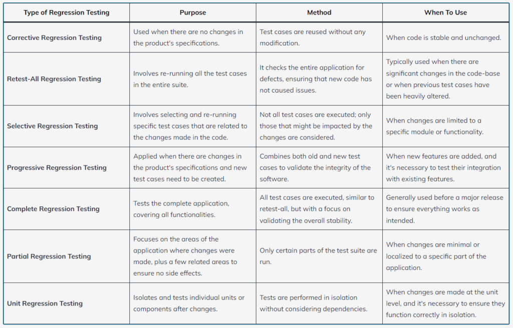These types of regression testing help ensure that both new and existing code work together harmoniously after any updates or changes.