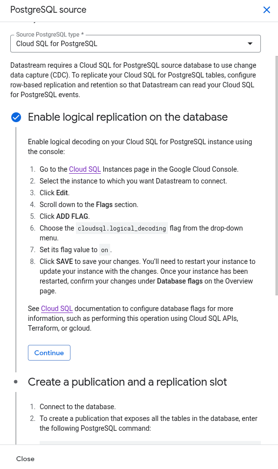 Provide the details, such as the replication slot name and publication name, that you created earlier in guided steps.