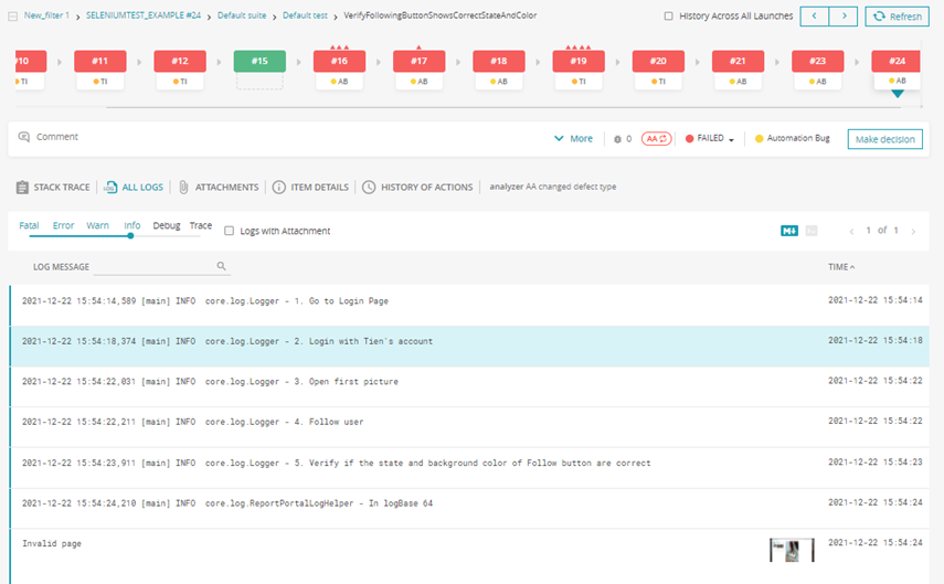 ReportPortal not only includes attached logs and screenshots but also provides an execution history of test scripts. This valuable feature enables us to assess both the product’s stability and the effectiveness of the automation test scripts.