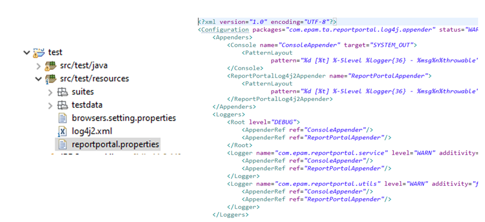 Configure the log4j to write data to ReportPortal by creating log4j2.xml into src/test/resources folder with the following content.