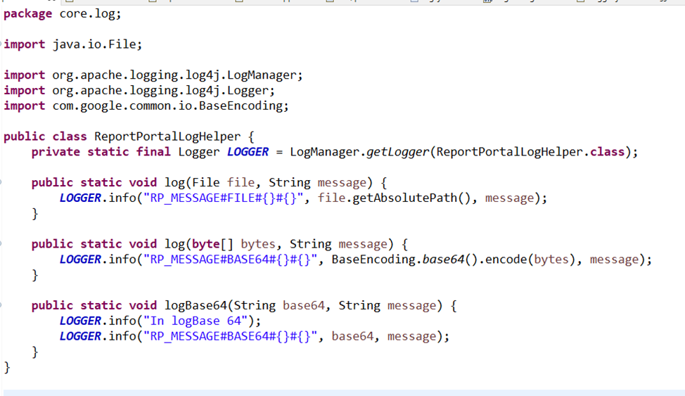 ReportPortalLogHelper class with following content for capturing the screenshot in Base64 format, and log with log4j.