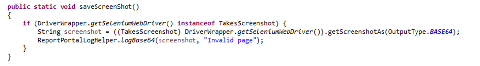 Implement function saveScreenshot to write screenshot into ReportPortal. To make sure that the output type should be Base64 when I call function getScreenshotAs of Selenium.