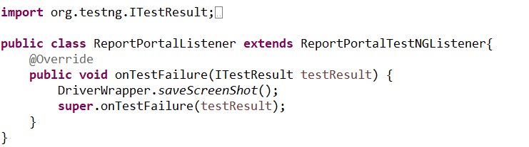 Create ReportPortalListener class: in my sample, I take a screenshot when the test is failed, so I create ReportPortalListener class to handle onTestFailure event.