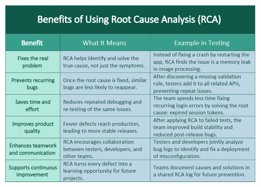 When testers consistently apply RCA, software quality improves across the board. Instead of firefighting the same bugs, teams learn from every issue and prevent new ones from forming.