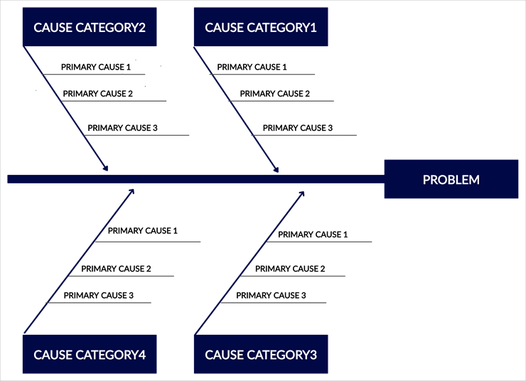 The Fishbone Diagram, also known as the Ishikawa or Cause-and-Effect Diagram, is used when multiple factors might contribute to a problem. It helps visualize potential causes by categorizing them into logical groups. The diagram resembles the skeleton of a fish: the “head” represents the main problem, while the “bones” branching off represent major categories of potential causes.