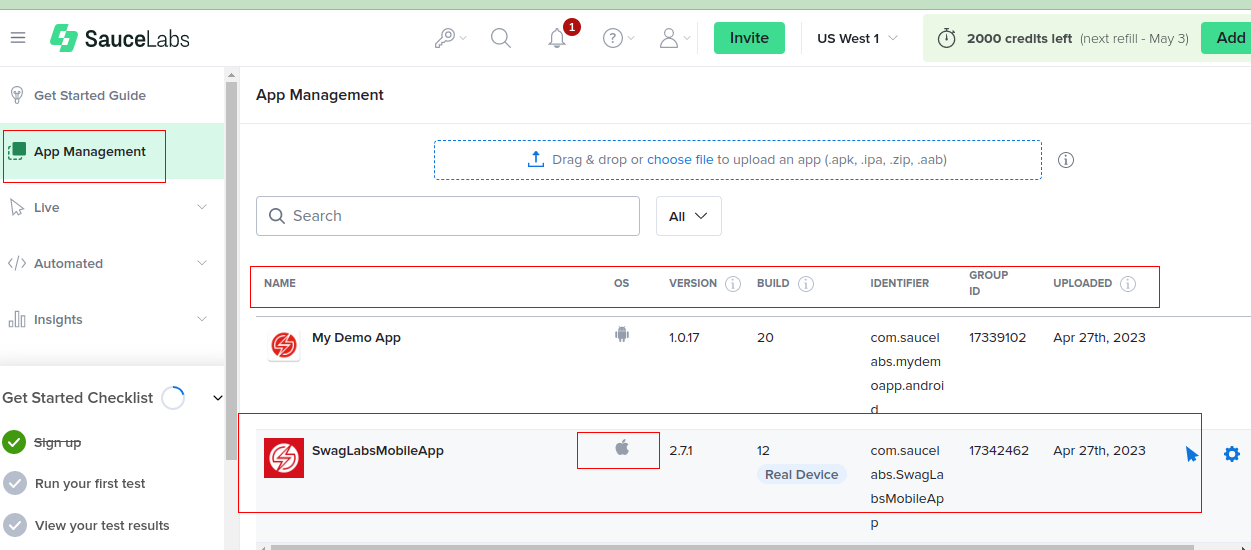 Before running your first iOS test, you need to ensure that your app is successfully uploaded to the Sauce Labs server. You can verify this by navigating to the Sauce Labs Dashboard, where all uploaded apps are listed.