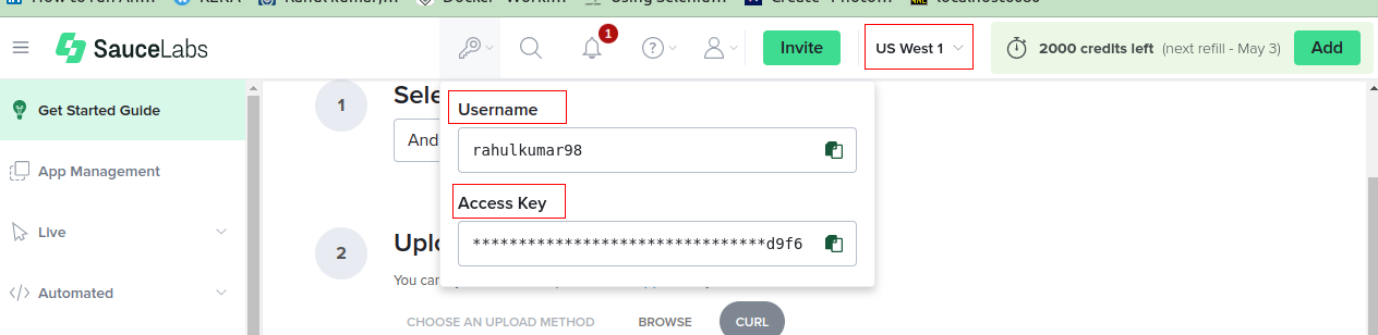 Since I am using a free account, my credit score is 2000, shown on the right side of the image. It will refill after 7 days, giving Sauce Labs an advantage over BrowserStack.