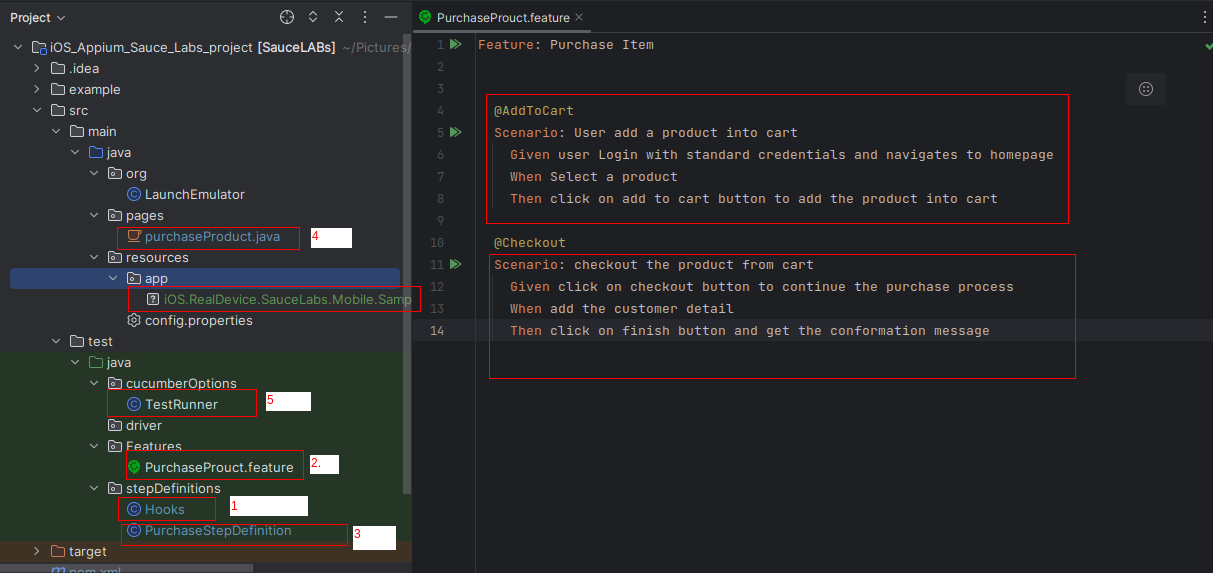 As you can see in the POM file, I built a framework based on Appium, JUnit, and Cucumber.