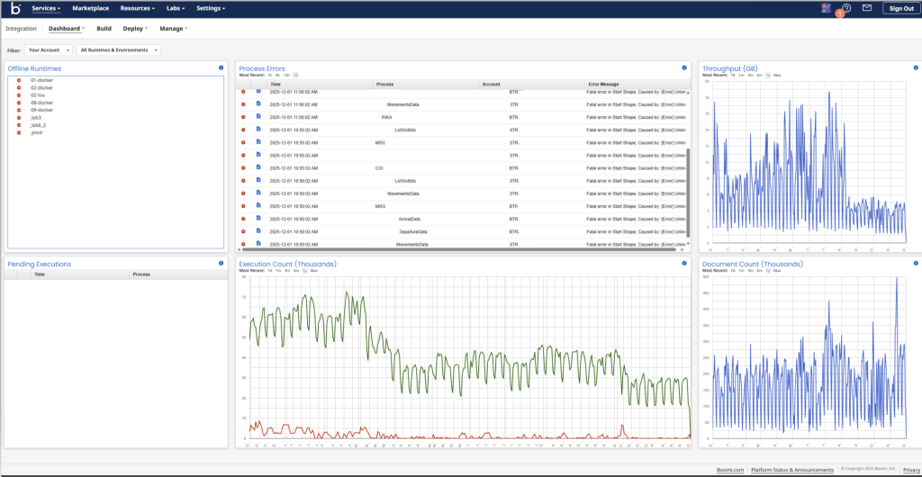 Boomi provides a set of monitoring dashboards that give real-time visibility into the health and performance of your integrations. These dashboards help you quickly identify issues, track activity, and understand how your processes are behaving across environments.