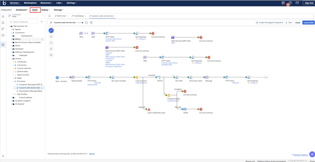 The Build tab is where you design and construct your integration workflows, known in Boomi as processes. Each process is made up of individual shapes (or steps), with each shape performing a specific function such as connecting to a system, transforming data, routing logic, or handling exceptions.