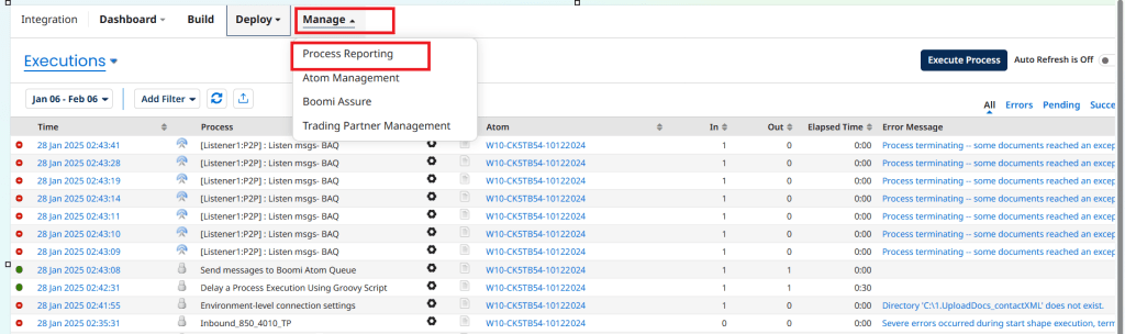 - Boomi provides process-level reporting that lets you track execution history, success/failure rates, throughput (documents processed), and latency across all environments (Dev, Test, Prod). This helps you spot errors or bottlenecks quickly.
