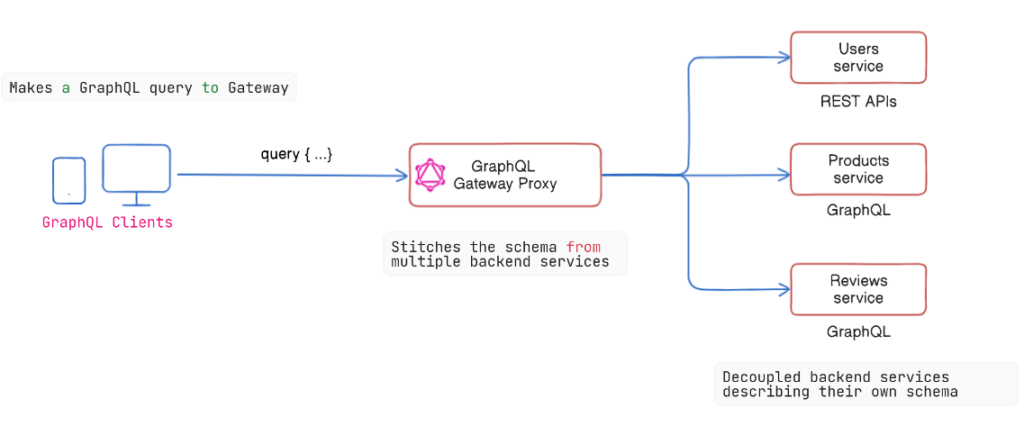 • Gateway Layer: Acts as an intermediary that stitches together schemas from microservices.