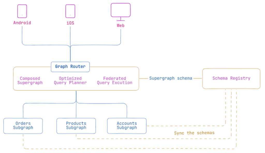 • Subgraphs: These are the smaller parts of the big GraphQL API, each with its own schema, rules, and data sources.