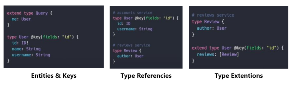 • Entities: These are types that can be referenced across different services. They are defined using the @key directive, which specifies the fields that uniquely identify the entity.