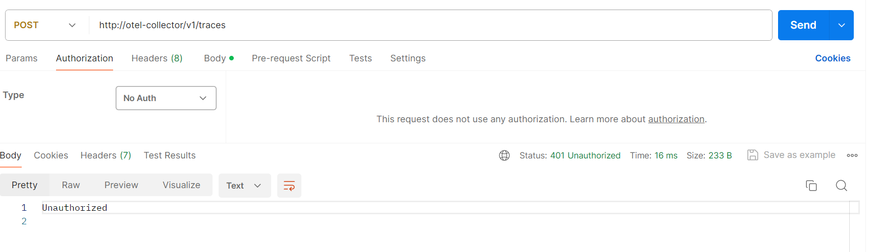 extensions: oidc: issuer_url: http://identity:8080/realms/opentelemetry audience: account attribute: Authorization receivers: otlp: protocols: grpc: http: auth: authenticator: oidcWe can call the Otel-Collector receiver endpoint with No Auth to verify the OIDC authenticator. it responds 401 Unauthorized.