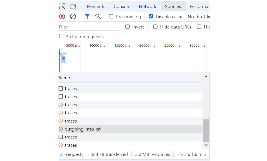 - Click the Trace button, and you will see in the Network tab there are some requests to Backend API /api/outgoing-http-call and Otel-Collector endpoint http://otel-collector/v1/traces