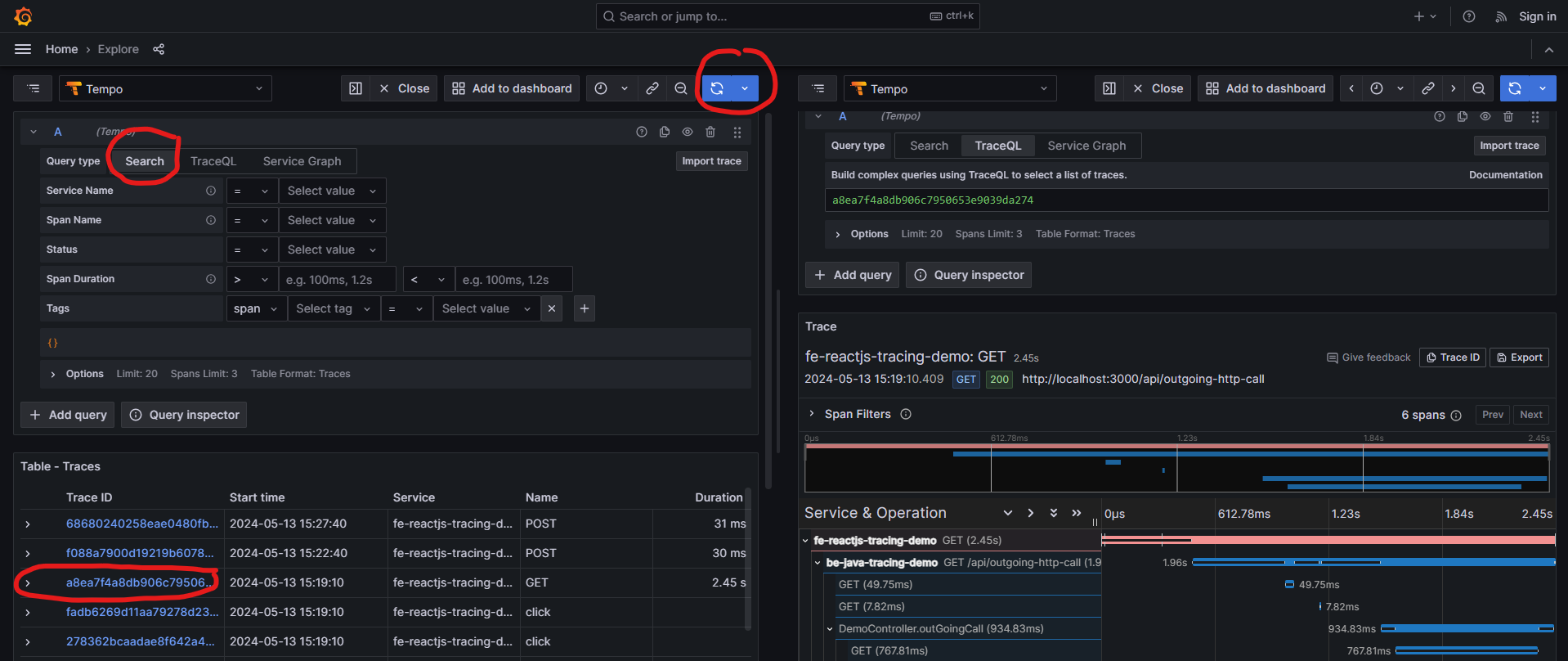 - Choose Search -> Run Query -> Select traceid with GET method, you will see a full trace from frontend to backend: fe-reactjs-tracing-demo -> be-java-tracing-demo -> http://google.com