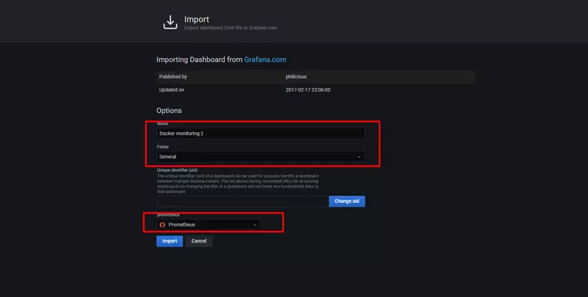 - Grafana → Dashboards → Import