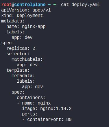 apiVersion: apps/v1 kind: Deployment metadata: name: nginx-app labels: app: dev spec: replicas: 2 selector: matchLabels: app: dev template: metadata: labels: app: dev spec: containers: - name: nginx image: nginx:1.14.2 ports: - containerPort: 80