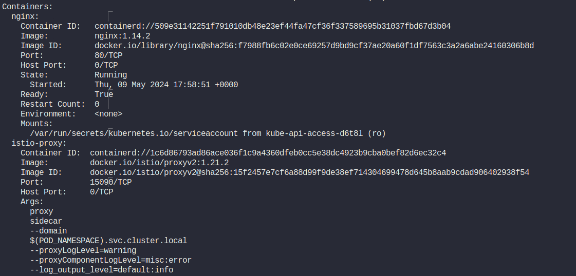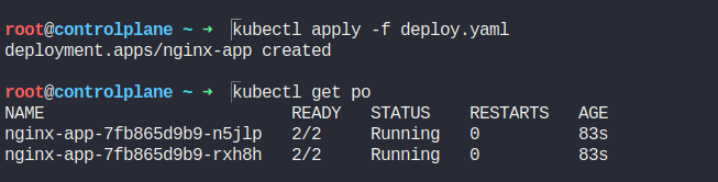 As you can see from the image above, it has spinned up two containers. Here, a sidecar container is automatically injected to the pod.