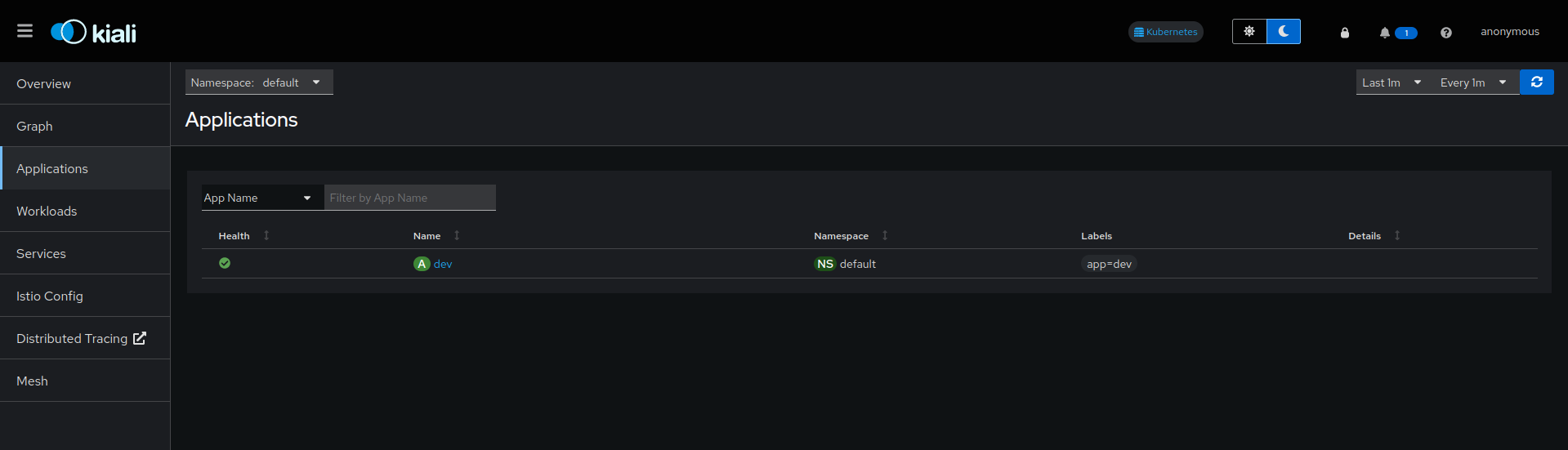 Kiali dashboard will open in your browser. Click on the applications tab in the left bar to view the sample app you deployed earlier.
