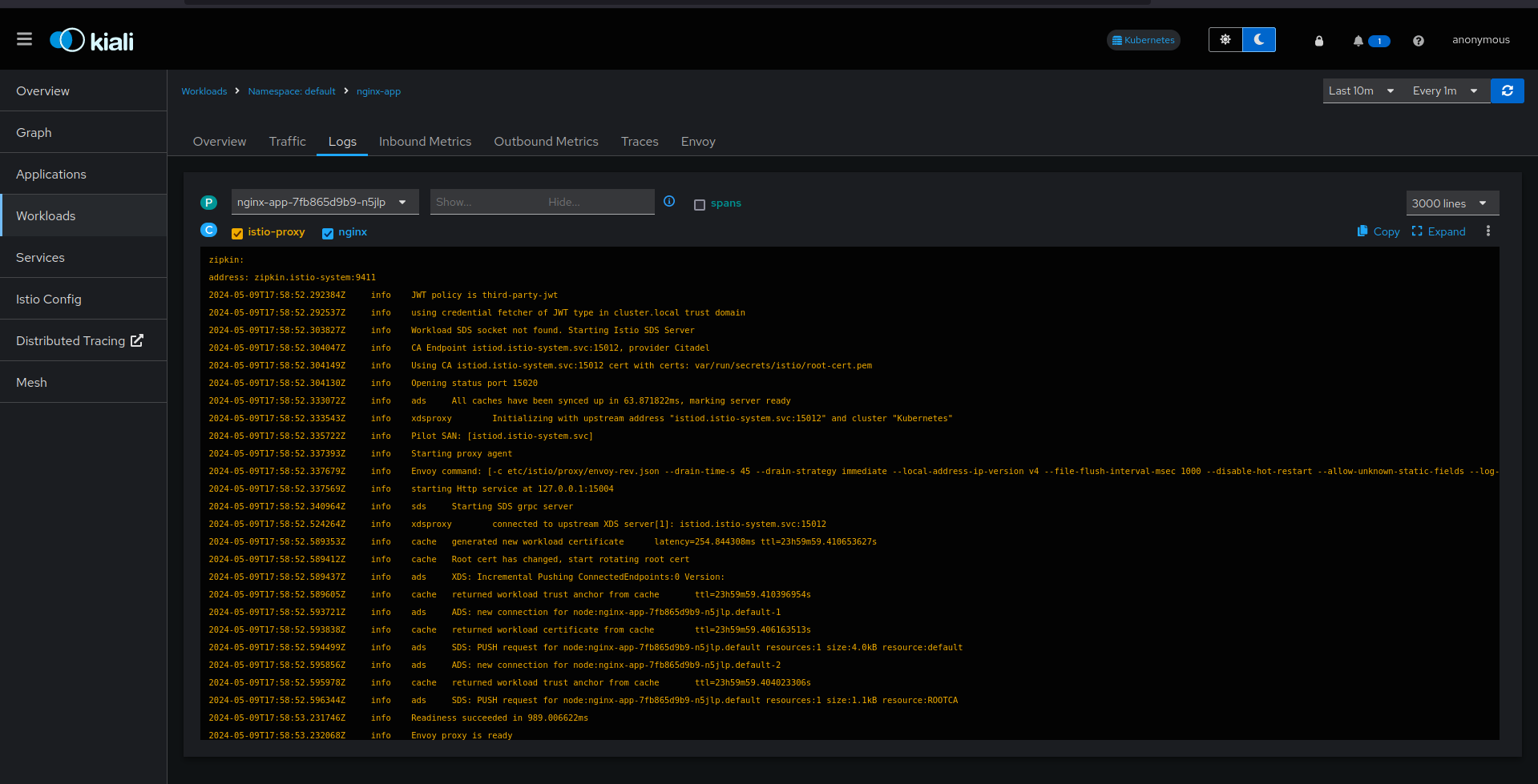 Next, click on Workloads > nginx-app. Istio also provides you the option to view application logs for debugging purposes. You can view the logs of all the containers.
