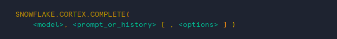 Like other LLMs, COMPLETE simply accepts a prompt from the user (along with the model that will be used) and generates a response from the model. All of it is done, though, using SQL statements. Using the snowflake-arctic paradigm, the following is a syntax: