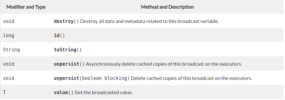 NOTE : When your work is complete with a broadcast variable, you should destroy it to release memory.