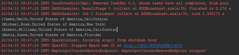 This example defines commonly used data (country and states) in a Map variable and distributes the variable using SparkContext.broadcast() and then use these variables on RDD map() transformation