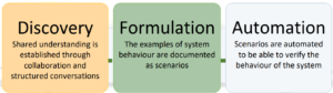 Behavior Driven Development (BDD) is about understanding, documenting & verifying business requirements through illustrative scenarios. BDD is composed of 3 practices: Discovery, Formulation, and Automation.