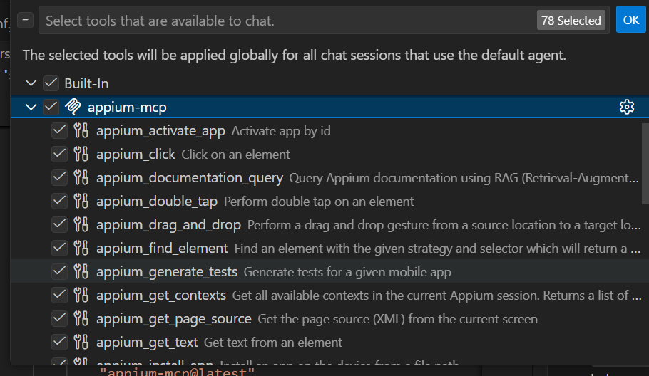 Start the Appium MCP. You can validate it by checking the updated tools in Github Copilot