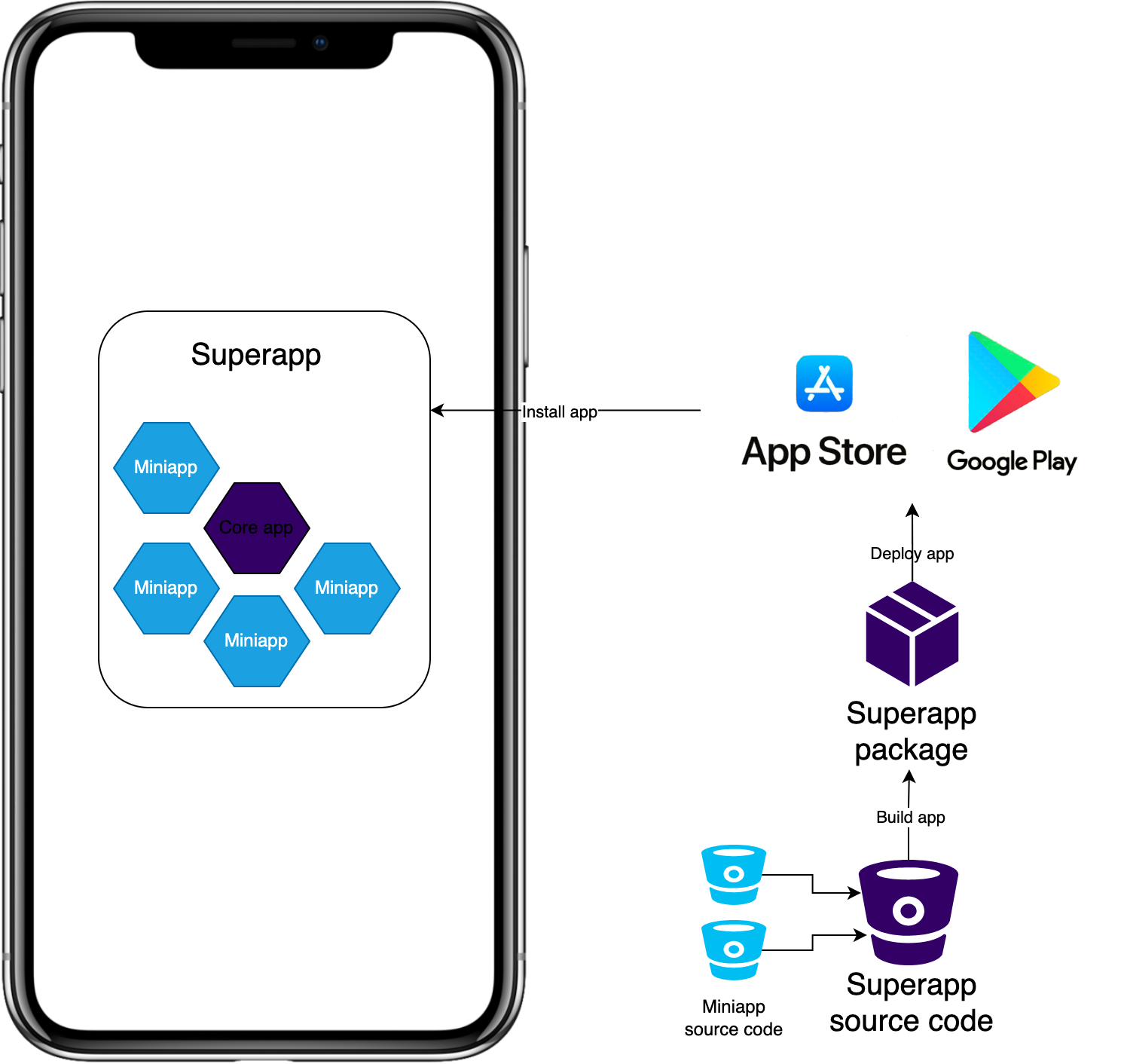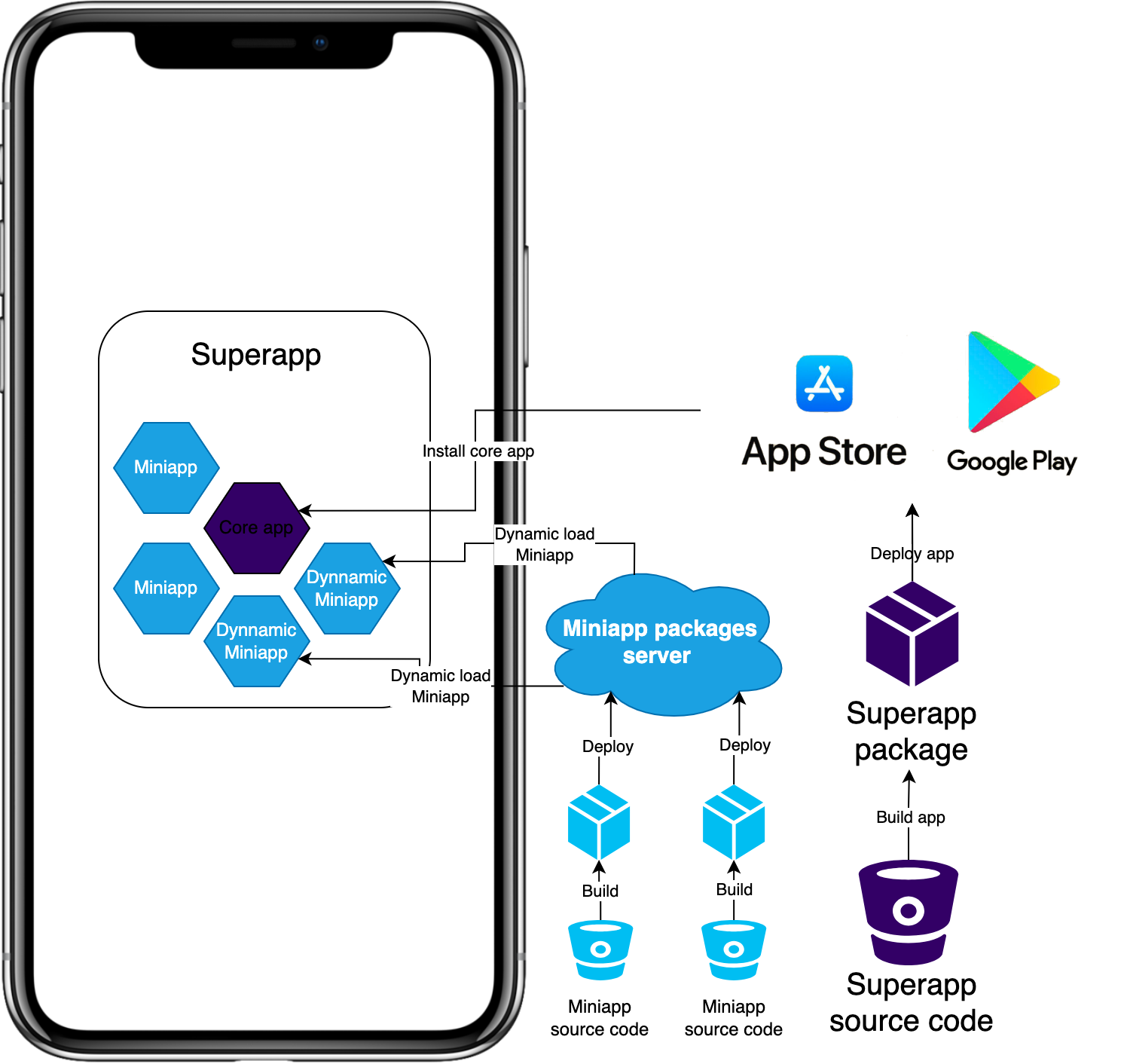 A Super app normally contains miniapps, these are independently created applications or services that are integrated into the super app platform. They provide users with specific domain services, such as gaming, food delivery, travel bookings, etc. The super app offers a set of core features alongside access to these mini apps. These core features typically form the backbone of the application and may include messaging, payments, social networking, etc. Users can choose and activate these mini apps within the super app to customize their experience and access additional functionalities.