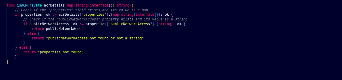 Now it is time to write the main function to identify whether the ACR is private or not. This function will fetch the value of particular key from the JSON which we fetch from the last function. It will check the values of publicNetworkAccess. If it is enabled then it is public otherwise it is private.