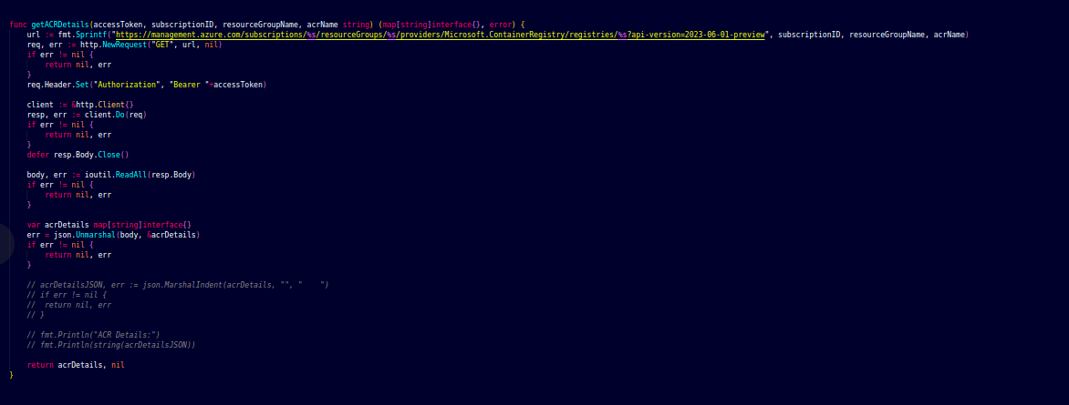 Now, we will write a function to fetch the ACR details which return the values in the JSON.
