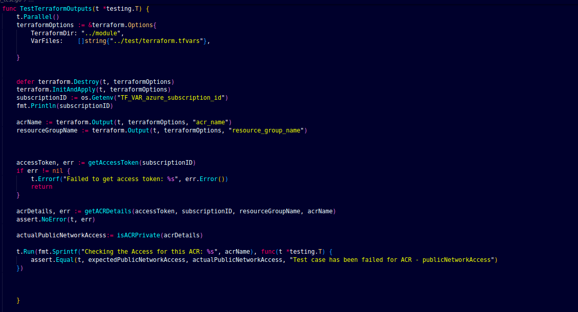 This is the main test function. Here, First of all, I am giving the path of the terraform module of ACR because terratest first executes the terraform module then runs the test cases on it then destroys the terraform resource. And in the next lines, we are passing a path to the terraform.tfvars. We are fetching a few details from the terraform output.tf file to use in the test like acrName, resourceGroupName, and subscriptionid from the environment variable.