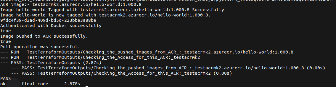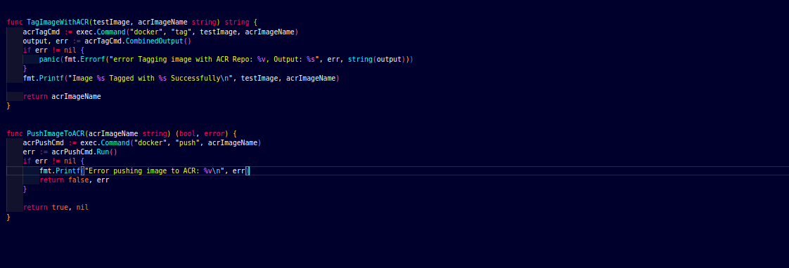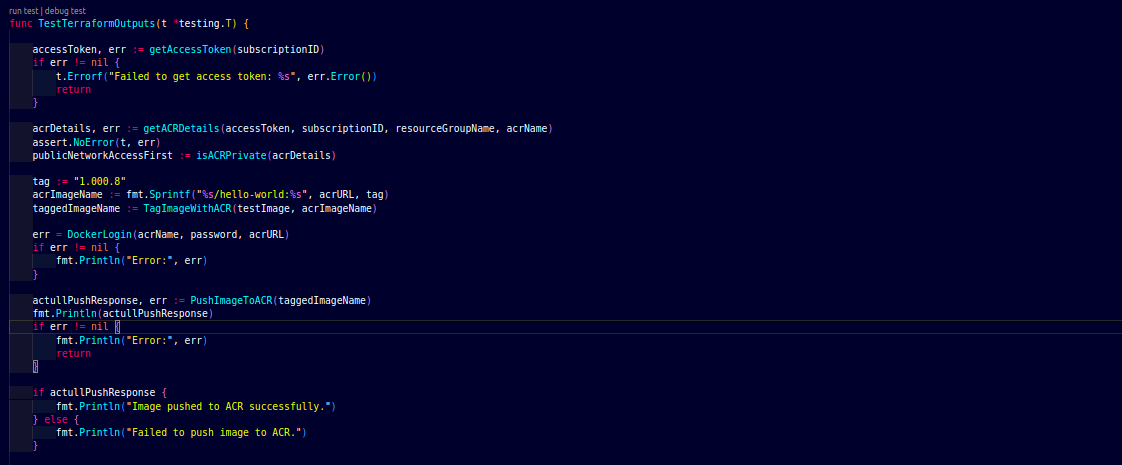 In this section, we will define all the functions that are required for the terratest test cases. First, we will fetch the access token, get details from the resource using rest API, checks whether the ACR is private or public, docker login, and then tag and push the images.