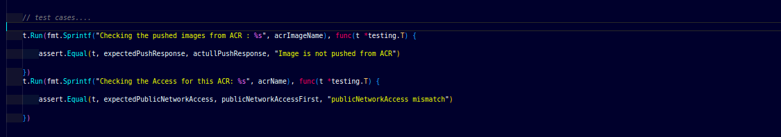 till now, we have stored the required values in the variables for the test cases. We have defined the two test cases one is checking whether the ACR is private or not and the other one is pushing the docker images to the private ACR.