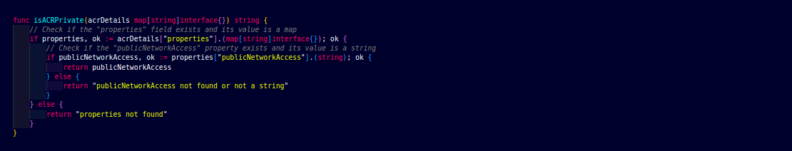 Here, we are checking whether ACR is private or not with the help of JSOn which we got the above function. There is a variable with the name publicNetworkAccess.