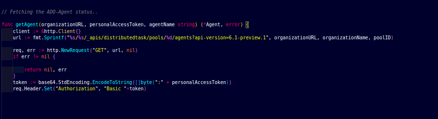 In this function, we will fetch the status of the ADO-Agent. First, we are calling the rest API to fetch the details of the ADO-Agent and using the personal access token of the ADO with API to establish the connection.