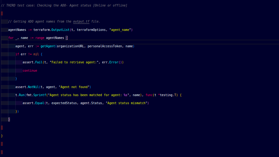 We are fetching the Agent name from the output.tf file and you notice that I am using for loop in this because I am assuming that you want to scale up or scale down the VM for ADO-agent and you must have more than one ADO-Agent. In that case, this terratest code can test all the Agents if you create more than one Agents.