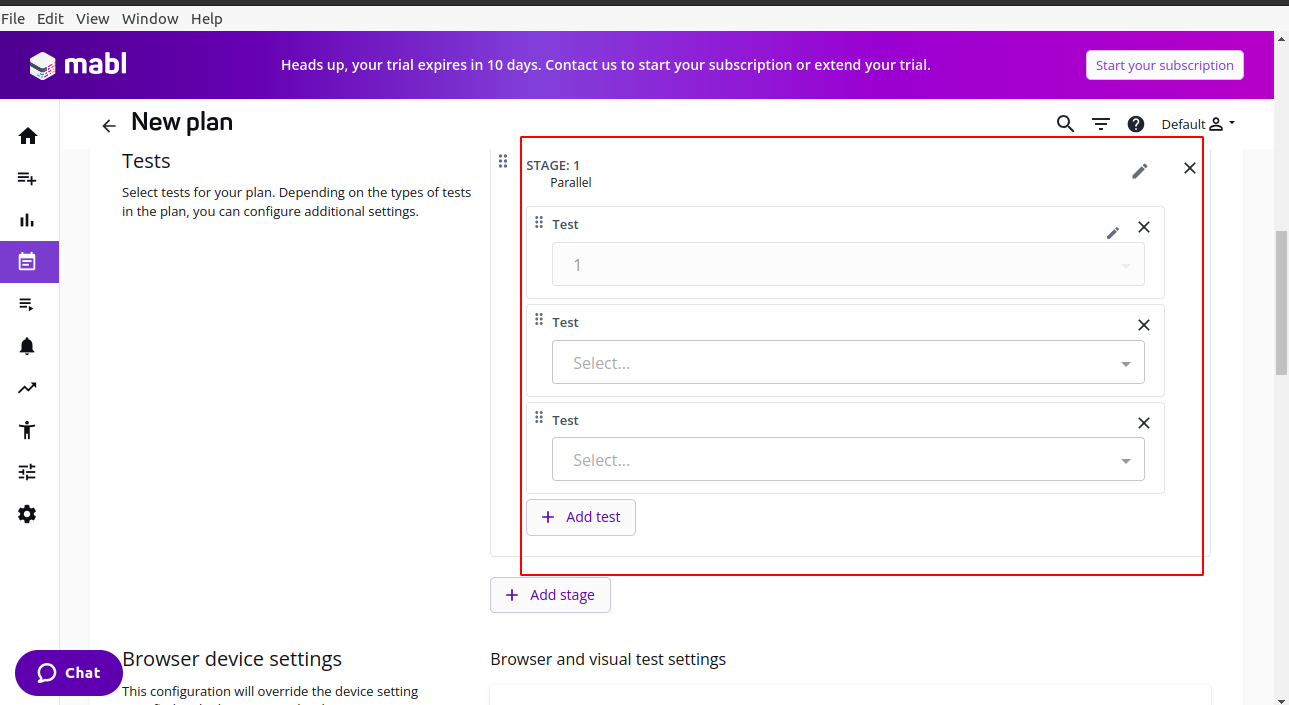 5.1.4 Fill in all the details such as Plan name, Description, Add Environment, and Add Tests under the Stage tab