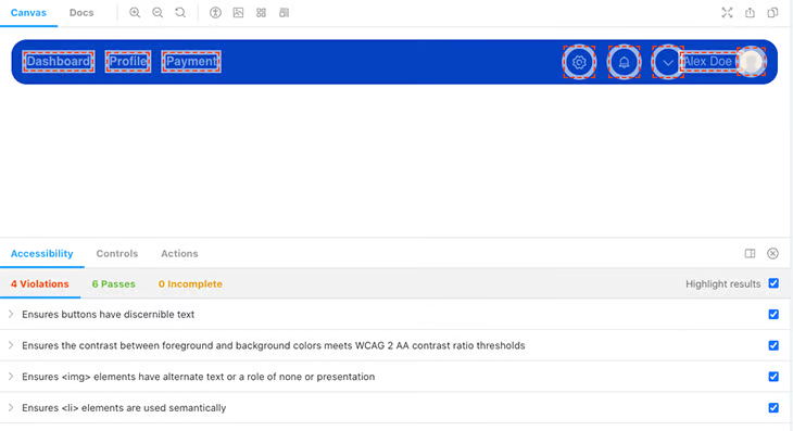 The navigation component is missing certain accessibility requirements, so axe enumerates four violations. The accessibility add-on comes with a Highlight results checkbox that helps identify the components that are failing. This can be very useful when dealing with larger components because it will save us from having to rerun these tests individually for each component.