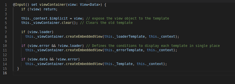 Finally, each time the View is changed insert the template into the container. For that, we can use createEmbeddedView API So let’s inject the ViewContainerRef Service.