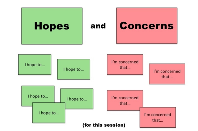 – Instruct participants to write down their hopes and concerns for the upcoming workshop, session, or period on post-it notes.
