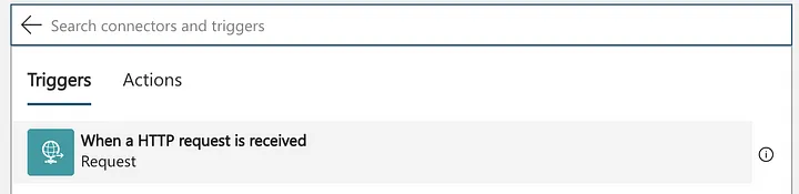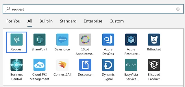 The Logic Apps Designer will open, displaying a search box. The first connector you add will serve as your trigger. Since we want to trigger this Logic App with an HTTP request, search for “request” and select Request.