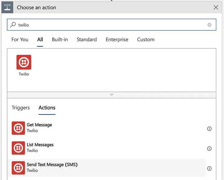 After setting up your Twilio account, return to the Logic App Designer. Click on “+ New step,” search for “Twilio,” and select Send Text Message (SMS).