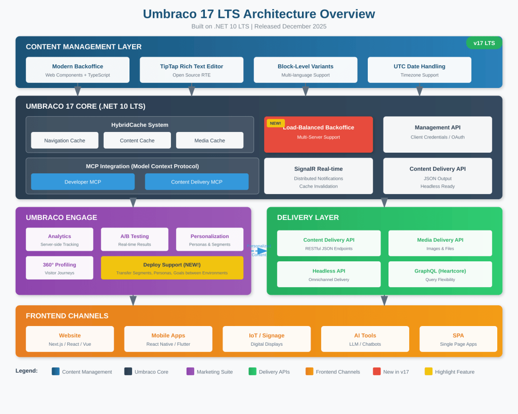 Umbraco 17 LTS (released December 5, 2025) is the most significant release in Umbraco’s recent history. Built on .NET 10 LTS, this Long-Term Support version introduces revolutionary features like load-balanced backoffice, consistent UTC date handling, the new Developer MCP for AI integration, and a completely modernized backoffice architecture.