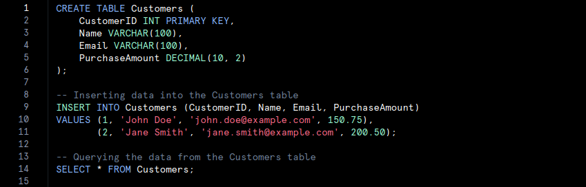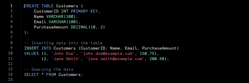 • In this code, a table named Customers is created with specific columns such as ‘CustomerID‘, ‘Name‘, ‘Email‘, and ‘PurchaseAmount‘. Data is inserted into the table and then queried. This organised structure allows for efficient data management and retrieval.