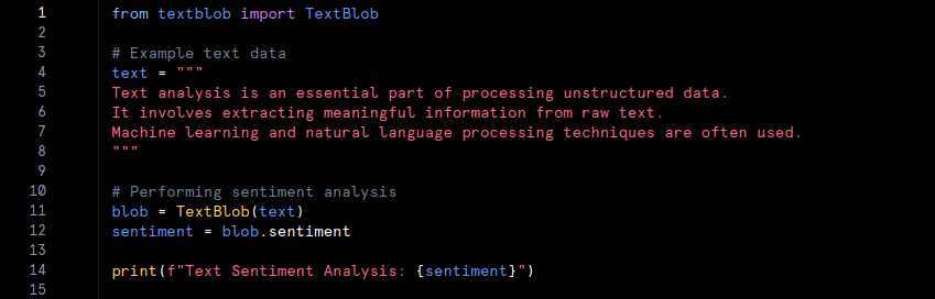 • In this example, unstructured text data is analysed using the ‘TextBlob‘ library. The text does not follow a specific format, and sentiment analysis is performed to extract meaningful insights. Advanced techniques, such as natural language processing, are employed to interpret unstructured data.