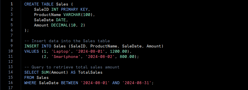 • We create a ‘Sales‘ table in a relational data warehouse, insert some sales data, and then run a query to calculate the total sales amount for August 2024.